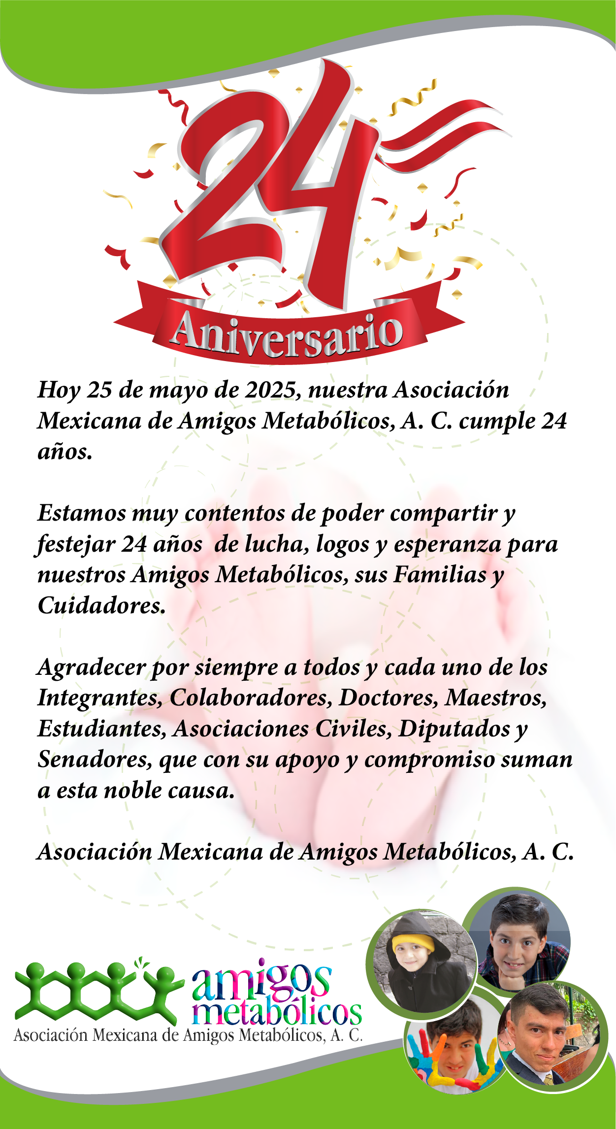 Hoy 25 de mayo de 2025, nuestra Asociación Mexicana de Amigos Metabólicos, A. C. cumple 24 años.